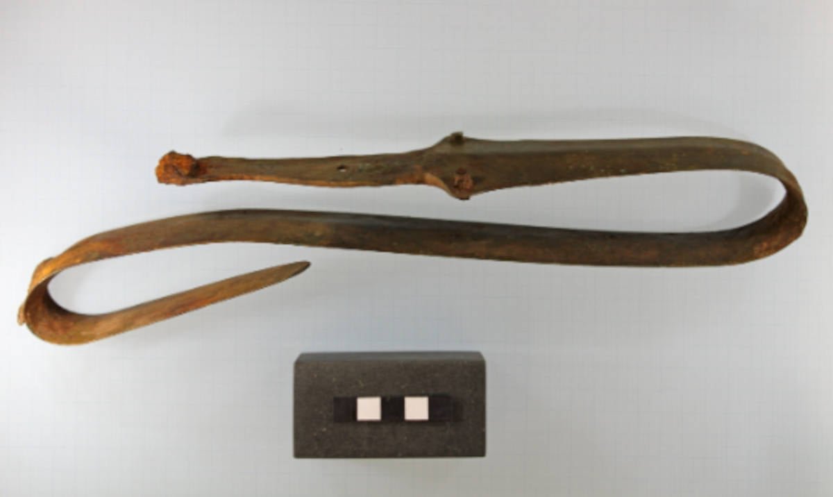 الصورة العليا: السيف المثني طقوسيًا والذي تم العثور عليه في Værebro Ådal، Veksø، الدنمارك. المصدر: بالي أوسترجارد سورنسن/رومو