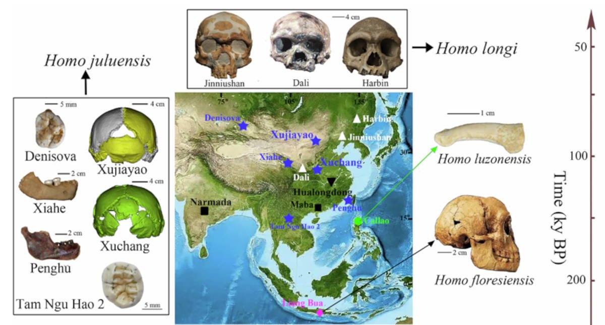Homo juluensis (النجوم الزرقاء الخماسية) تشمل Xujiayao، وXuchang، وXiahe، وPenghu، وDenisova، وTam Ngu Hao 2؛ هومو لونجي (مثلثات بيضاء) تشمل هاربين، دالي، وجينيوشان؛ Homo floresiensis (الماس الوردي) يشمل Liang Bua؛ يشمل Homo luzonensis (الدائرة الخضراء) كالاو. على الرغم من أننا قمنا في مكان آخر بتجميع Hualongdong (المثلث الأسود المقلوب) بشكل مبدئي مع حفريات H. longi، إلا أننا نبقيها منفصلة في الوقت الحالي في انتظار مزيد من البحث المستمر. في العديد من الدراسات، تم تجميع مابا ونارمادا (المربعات السوداء) معًا لتكوين مجموعة سكانية منفصلة. قد يكون من الممكن بعد مزيد من التحليلات أن يتم تضمين هذه الحفريات الأخيرة في الأنواع الأوسع من إنسان نياندرتال أو تعيين اسم تصنيفي جديد لها تمامًا. يشتمل الإطار المصاحب على معلومات وصفية لعينات النوع والمواقع الخاصة بأنواع أشباه البشر الأربعة التي تمت مناقشتها هنا: H. floresiensis؛ H. لوزونينسيس. حاء لونجي؛ H. جوليونسيس. (باي ووو/ الطبيعة)